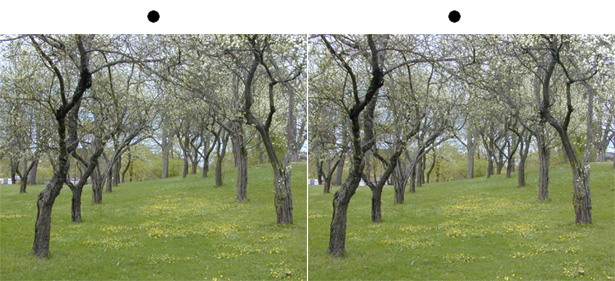The way it works is like this: Look at the pictures and somehow try to get them to merge into one. This can often be done by relaxing the eyes, as if actually looking at something very far away, because then the two eyes start to look in parallel lines, so that the left eye looks at the left picture and the right eye looks at the right picture. When that starts to happen you experience it as if the two pictures start to merge into one. When you get a perfect merge it becomes like in the real physical world and you see a three dimensional image. There are two sizes of the pictures, a big and a small version. The smaller version might be easier to get to work for you. The black dots are there to help in getting them to merge in the right way. There is also a huge size of the pictures for the cross-eyed viewing. |